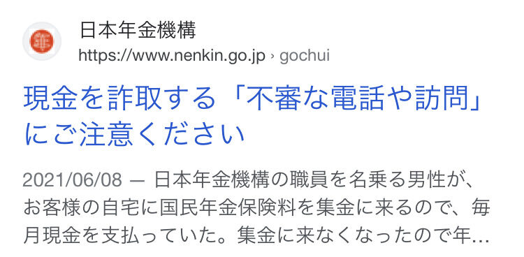 日本年金機構「現金を詐取する不審な電話や訪問にご注意ください」