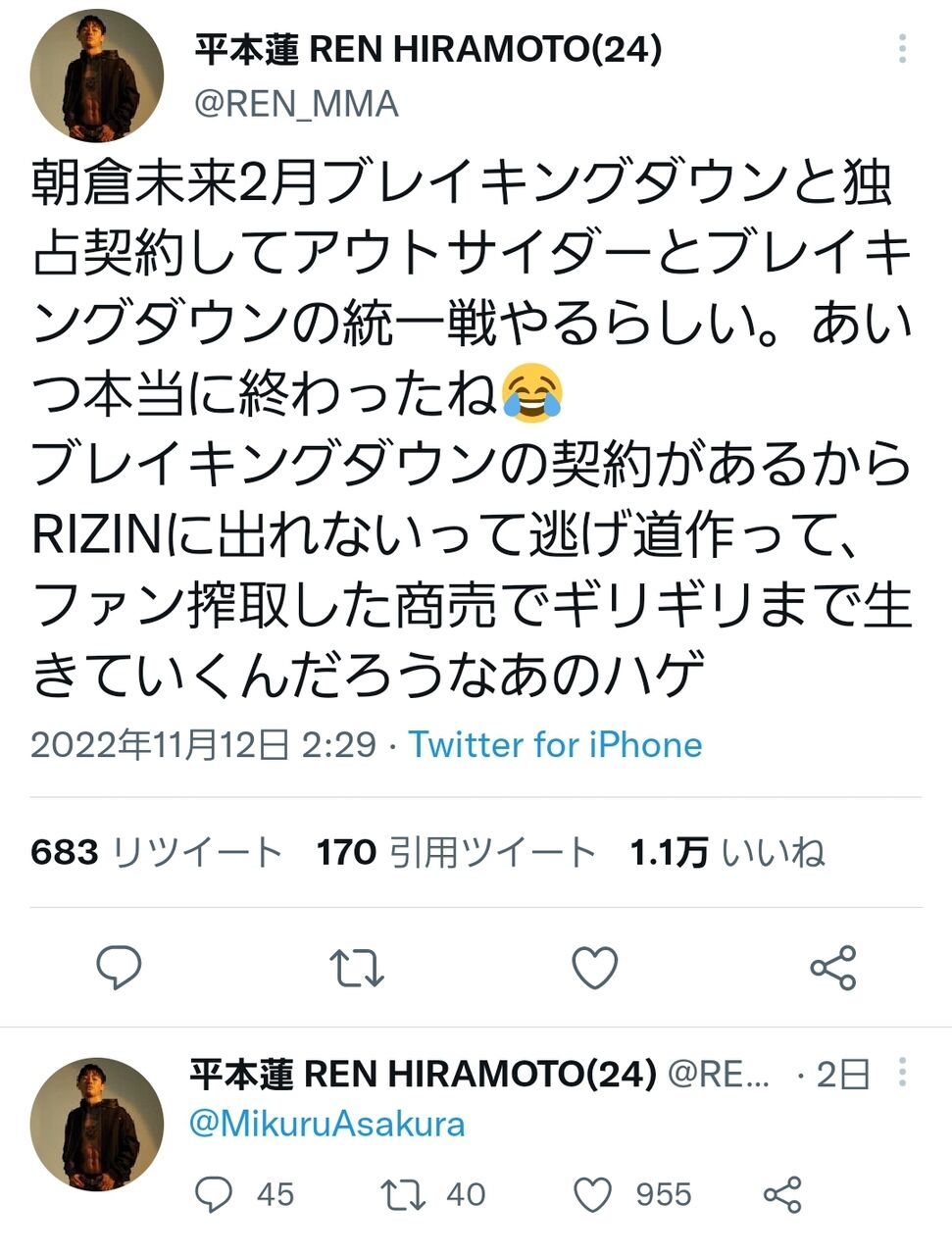 【悲報】平本蓮、朝倉未来の暴露をする