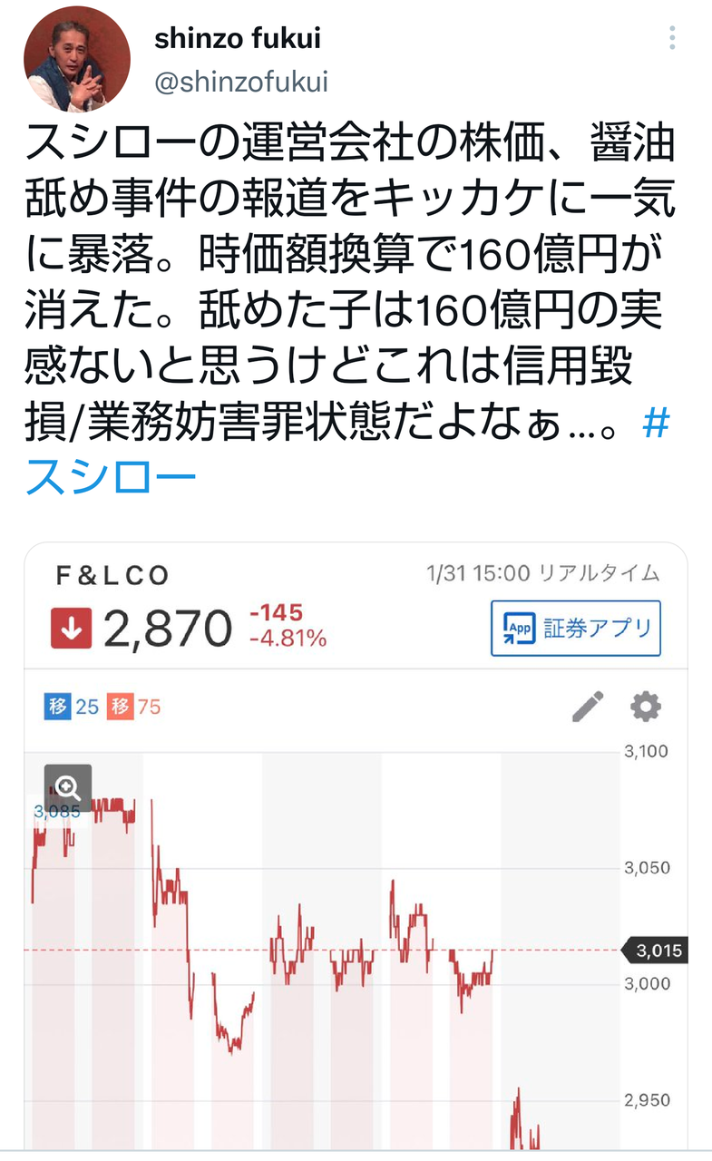 【悲報】スシローさん、株価がありえないくらい暴落してしまう…