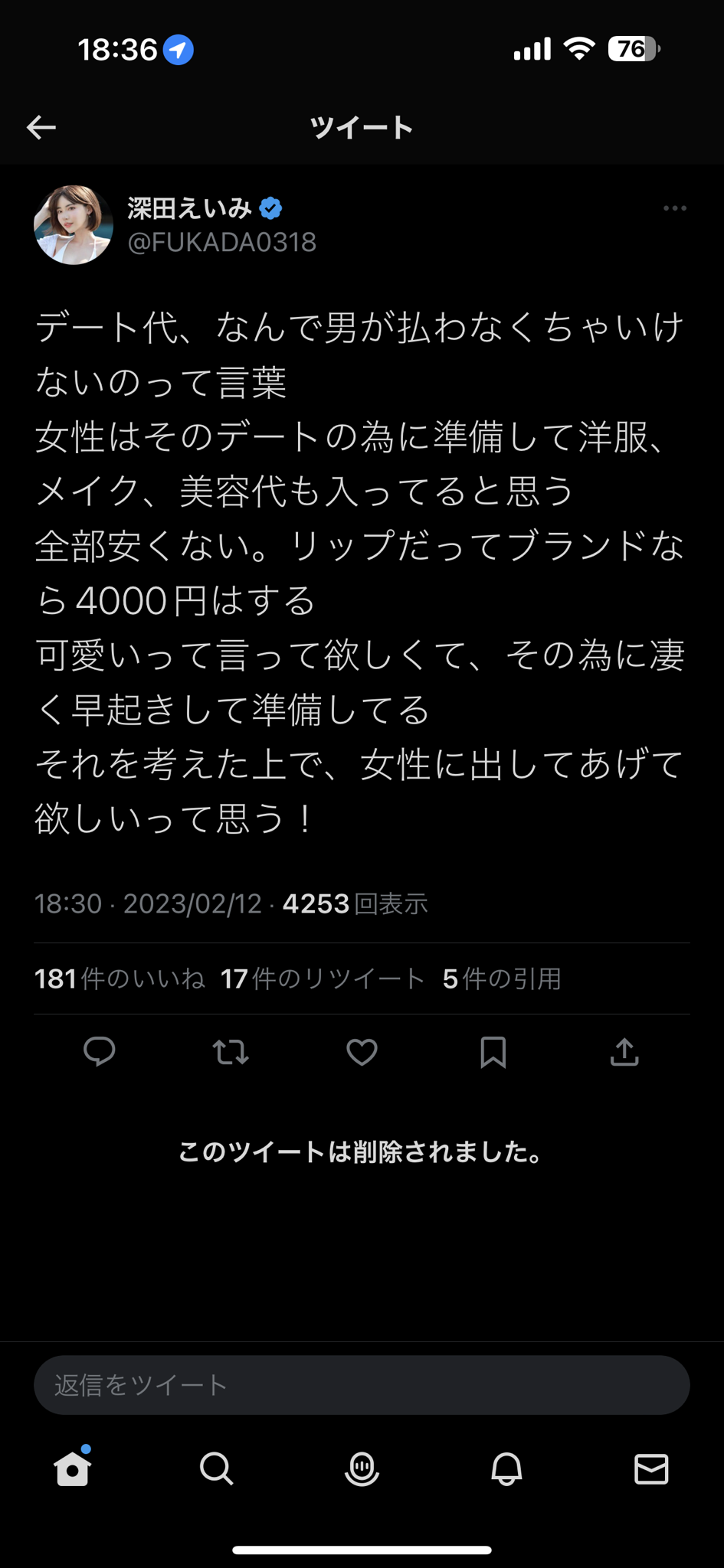 深田えいみさん「デート代は男が払って当然!」→ツイート削除