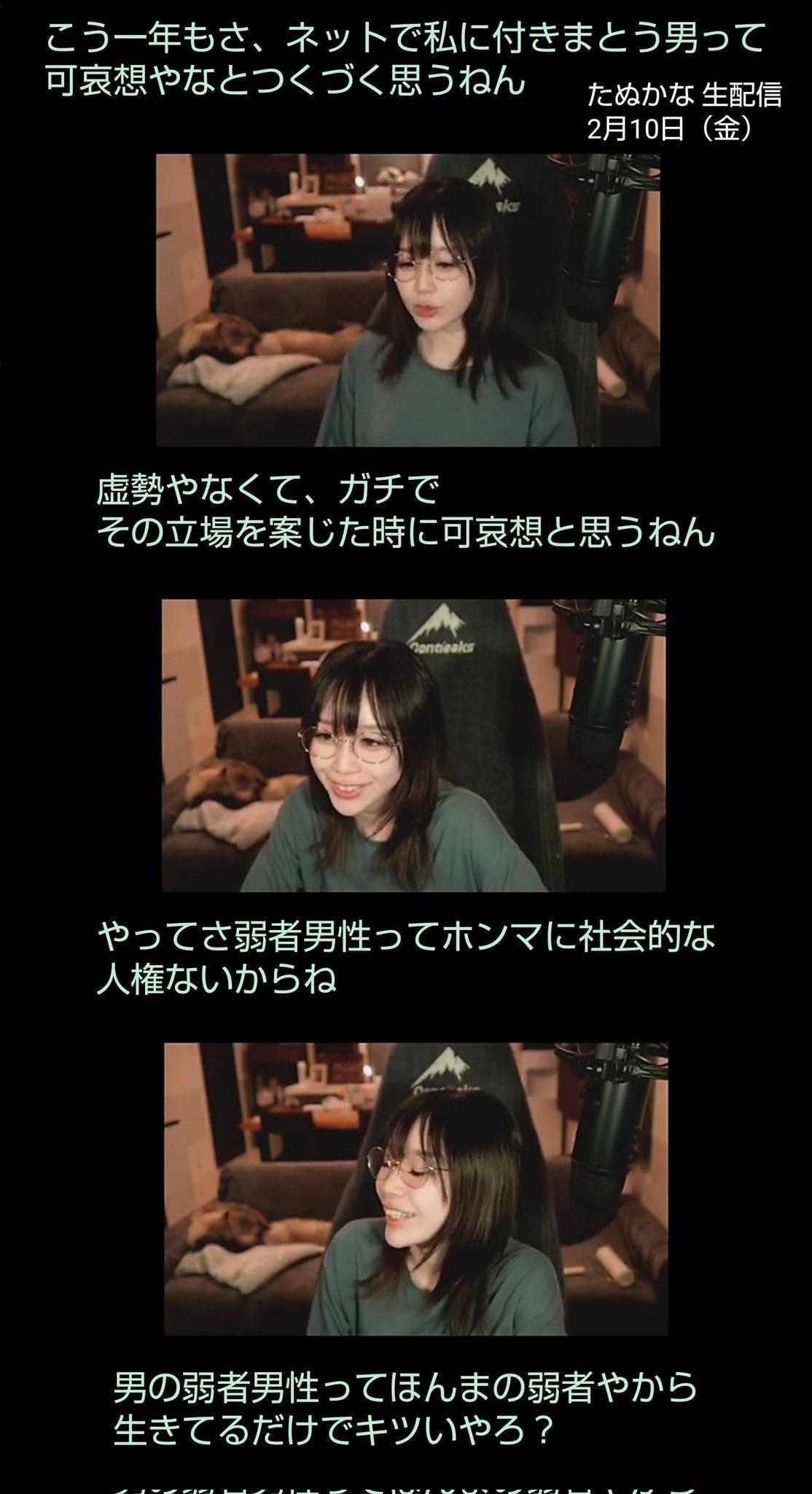 【悲報】たぬかな「弱者男性が唯一輝けるのがネットで女をこきおろして叩く、それだけなんですよ」