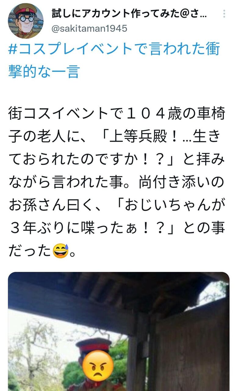 街コスイベントで104歳の車椅子の老人に、「上等兵殿!…生きておられたのですか!?」と拝みながら言われた事。尚付き添いのお孫さん曰く、「おじいちゃんが3年ぶりに喋ったぁ!?」との事だった😅。