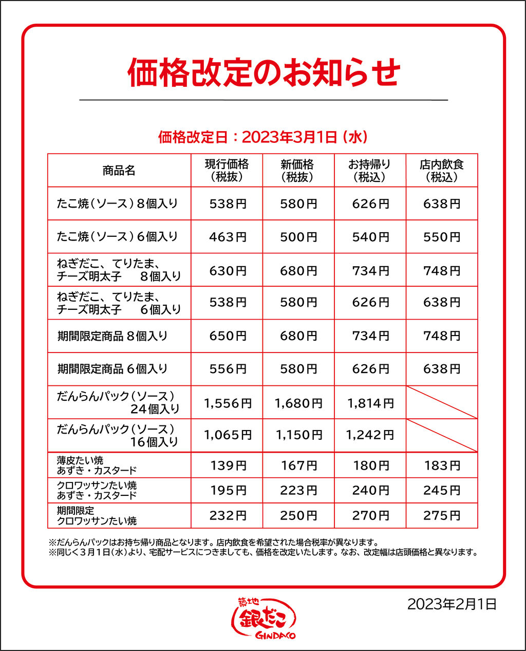「ねぎだこ」「てりたま」「チーズ明太子」の8個入りは、現行価格テイクアウト680円・店内693円から、新価格テイクアウト734円・店内748円となる。