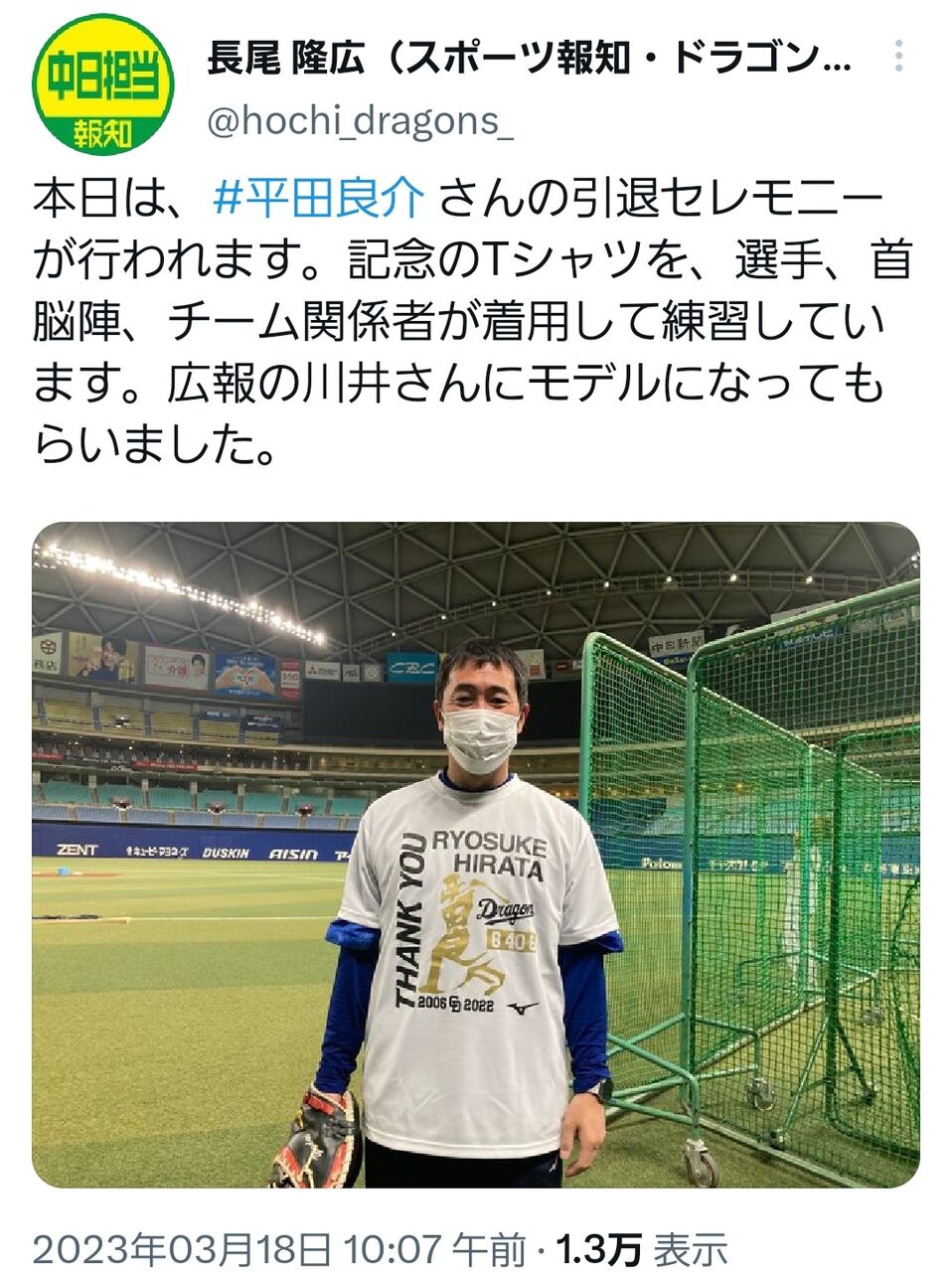 【朗報】中日球団関係者が「平田良介引退記念Tシャツ」を着る