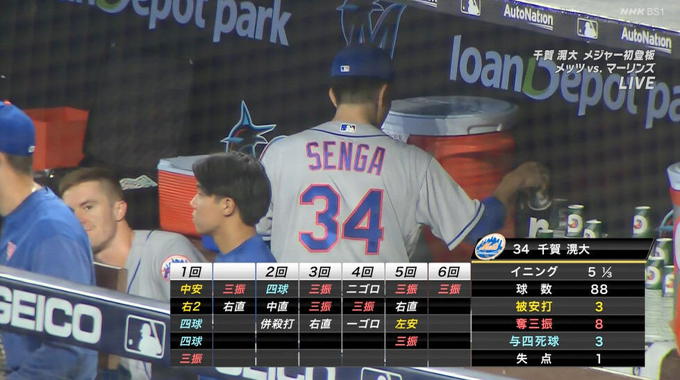 千賀滉大 5回1/3 88球 被安打3 奪三振8 与四球3 失点1