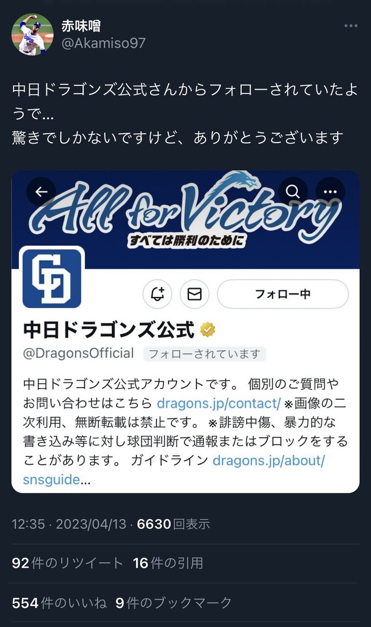 【朗報】中日ファンの赤味噌さん、中日公式にフォローされる