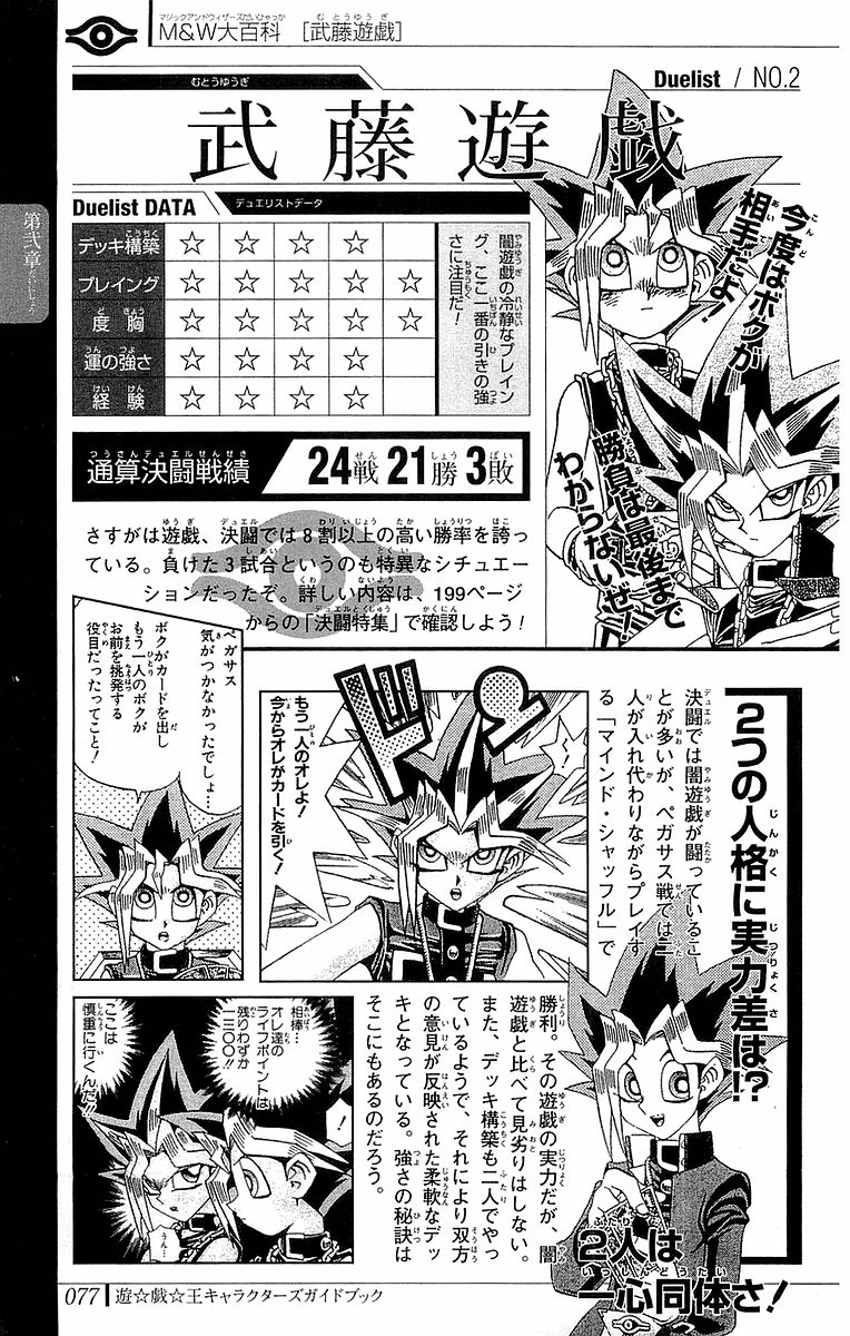 武藤遊戯 21勝3敗 城之内克也 9勝8敗 海馬瀬人 8勝5敗