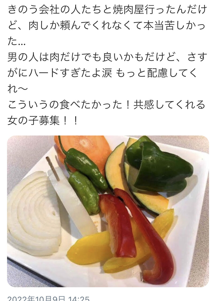【画像】女「男と焼肉行ったら肉だけ頼んでた…ありえない」