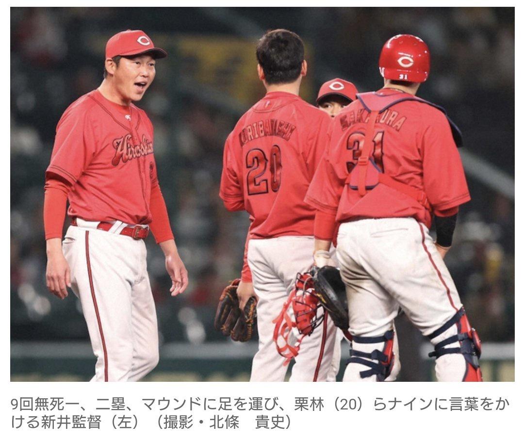 マウンドで新井監督は「お前で打たれたら本望だから。思い切って投げろ」と激励。栗林はその後、佐藤輝、原口を打ち取り、白星を守った。