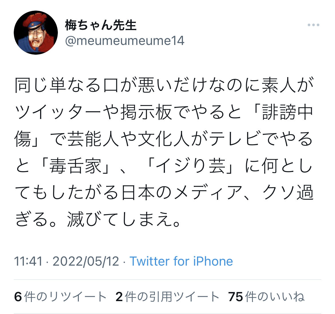 Twitter「素人がツイッターでやると誹謗中傷、芸能人がテレビでやるとイジリ芸。クソ過ぎる」