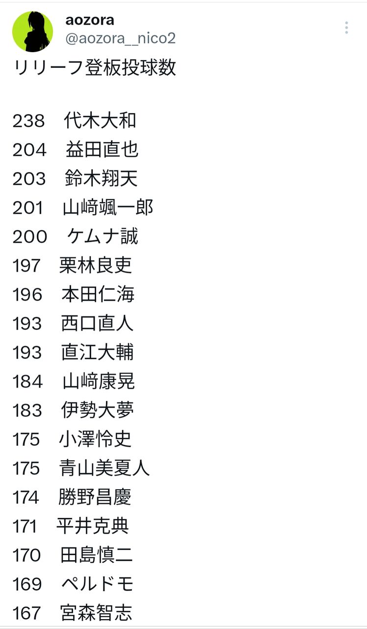 【悲報】高卒2年目巨人代木くん、今シーズンリリーフ最多投球数wwwwwww