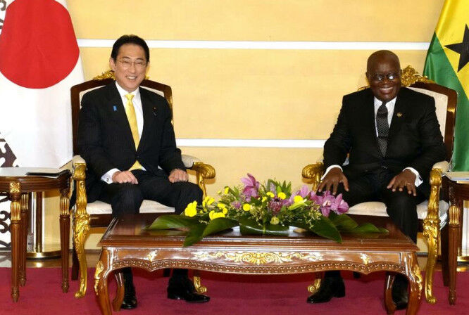 【アクラ共同】岸田文雄首相は1日(日本時間2日未明)、西アフリカ・ガーナの首都アクラでアクフォアド大統領と会談し、地域の平和と安定化に向けて3年間で約5億ドル(約687億円)の支援を行うと表明した。両首脳は、透明で公正な開発金融の重要性で一致した。