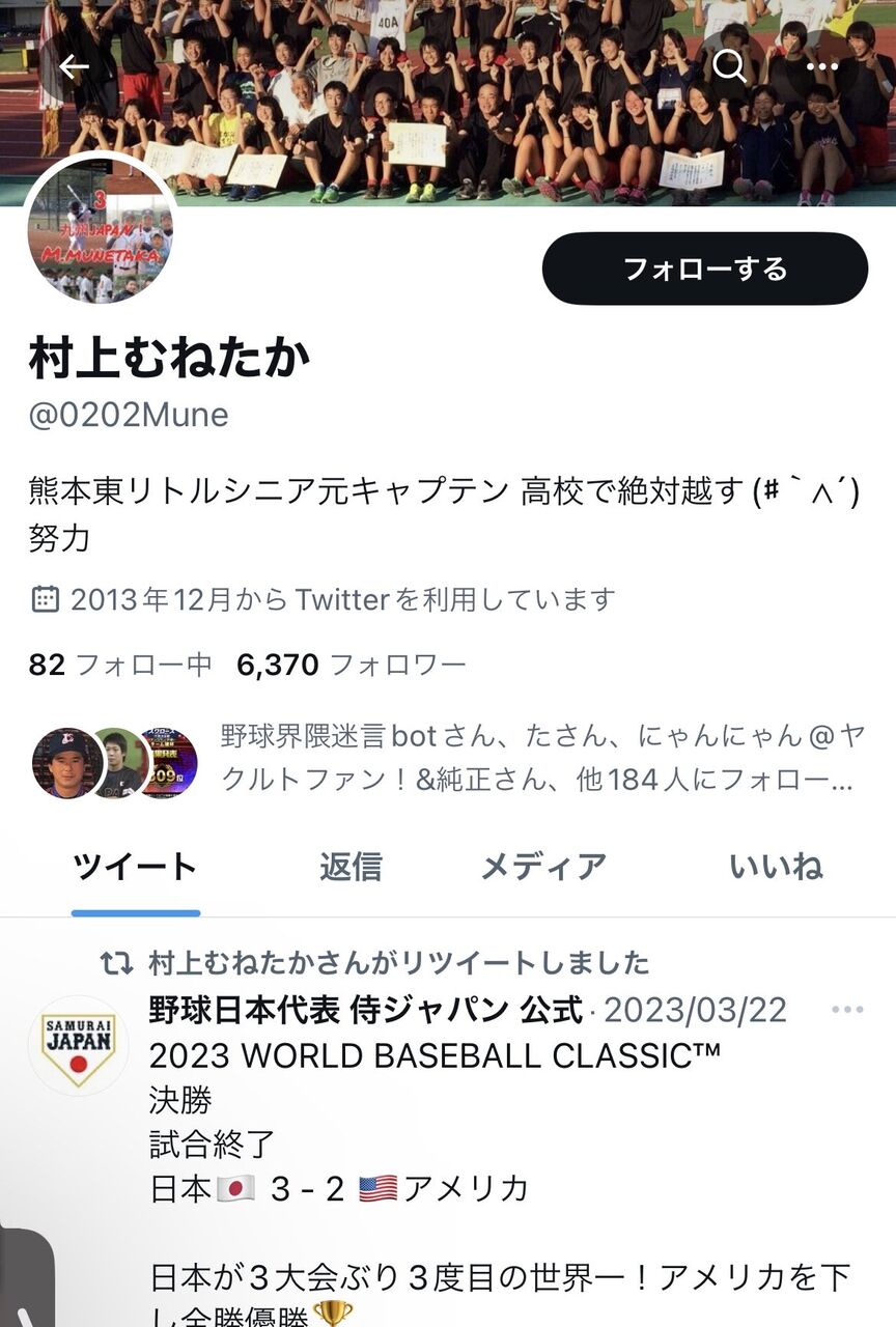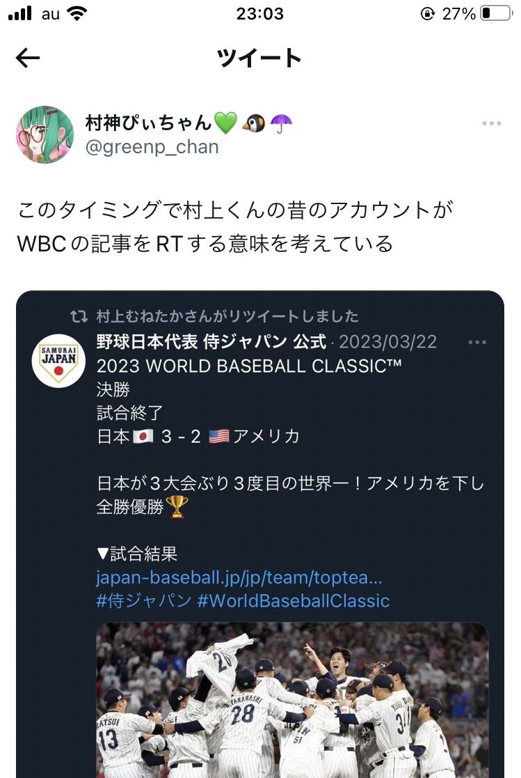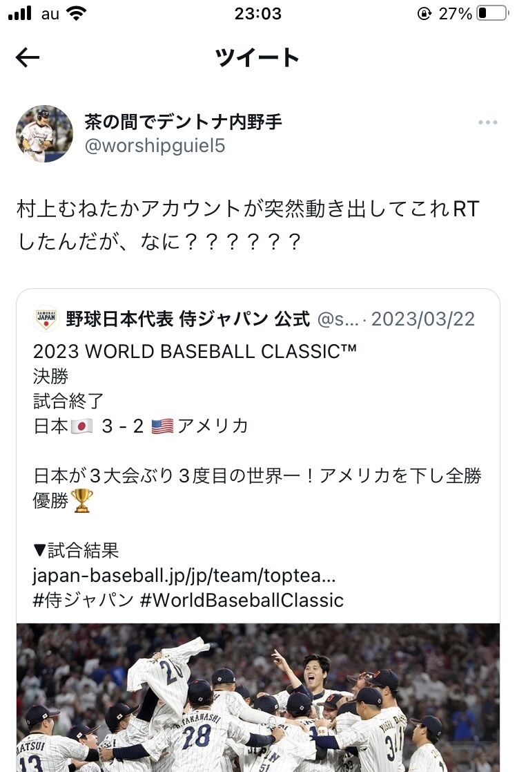村上宗隆、突然昔のアカウントで『WBC優勝』のニュースをRTするwwwwww