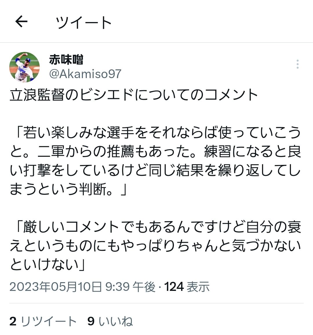 【悲報】立浪「(ビシエドは)自分の衰えにも気付かないといけない」