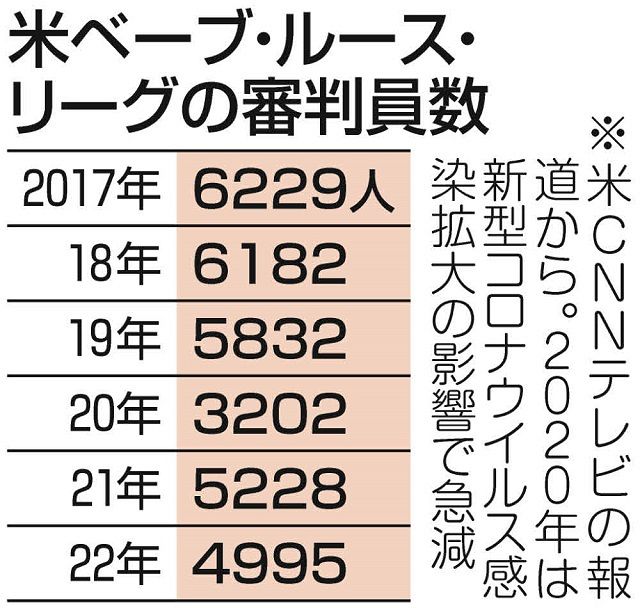 CNNテレビによると、全米規模の少年野球リーグ「ベーブ・ルース・リーグ」の審判員は2017年に6229人いたが、22年には4995人まで減少した。新型コロナ禍で試合ができない間に引退した審判員も多いが、親やコーチからの暴言、暴力が原因の一つとされる。