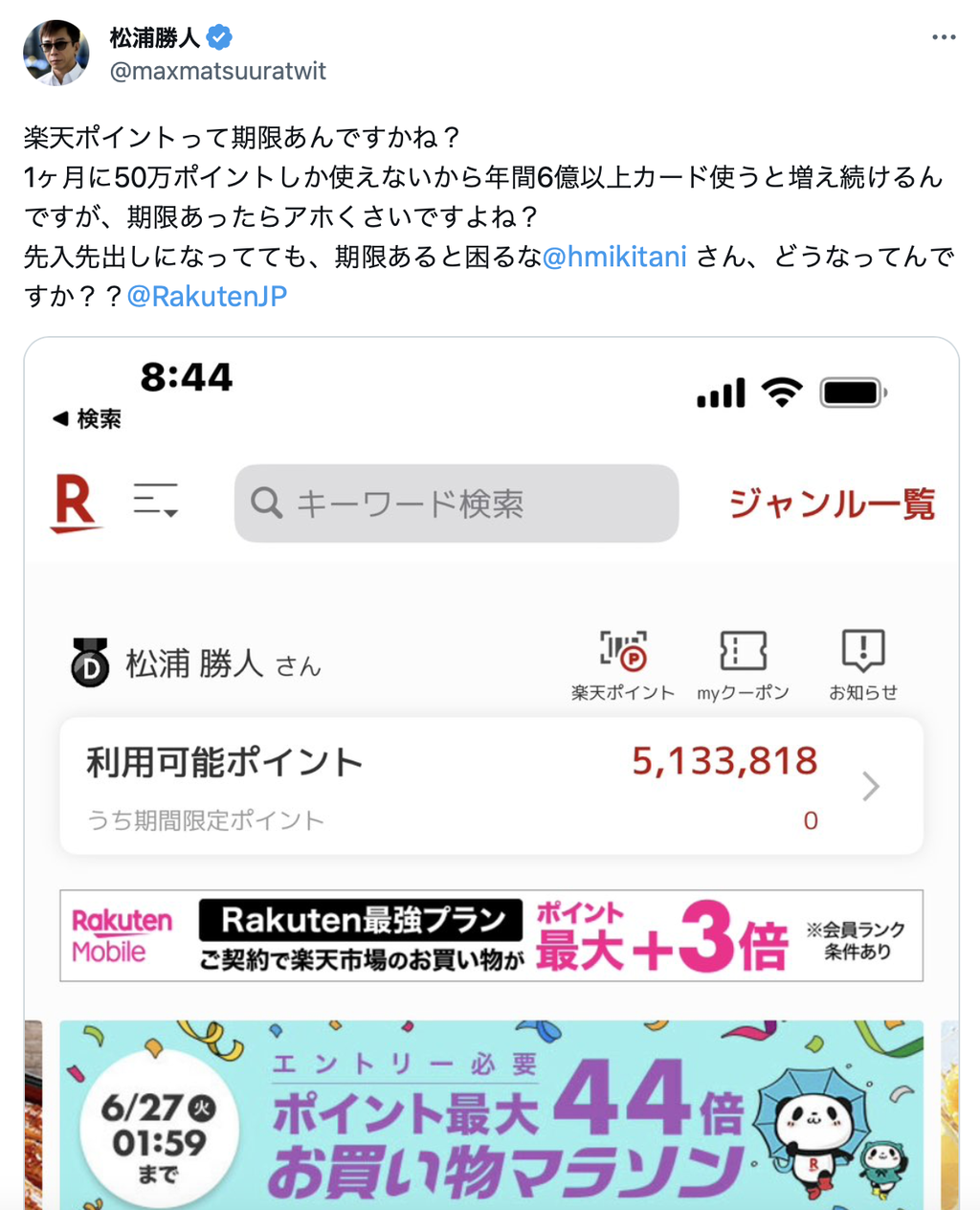 松浦氏は自身の楽天ポイントが表示されているページのスクリーンショットを貼付。そこには513万3818ポイントという数字が示されており、松浦氏は「楽天ポイントって期限あんですかね?1ヶ月に50万ポイントしか使えないから年間6億以上カード使うと増え続けるんですが、期限あったらアホくさいですよね?先入先出しになってても、期限あると困るな」とし「期限あると困るな@hmikitaniさん、どうなってんですか??@rakuten」と楽天と楽天グループ代表取締会長三木谷浩史氏のIDを入れて、ポイントに関する疑問をつづった。