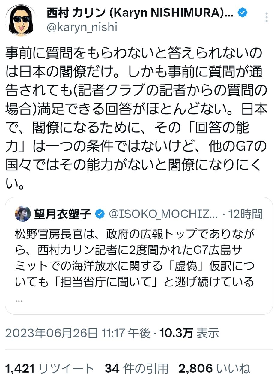 事前に質問をもらわないと答えられないのは日本の閣僚だけ。しかも事前に質問が通告されても(記者クラブの記者からの質問の場合)満足できる回答がほとんどない。