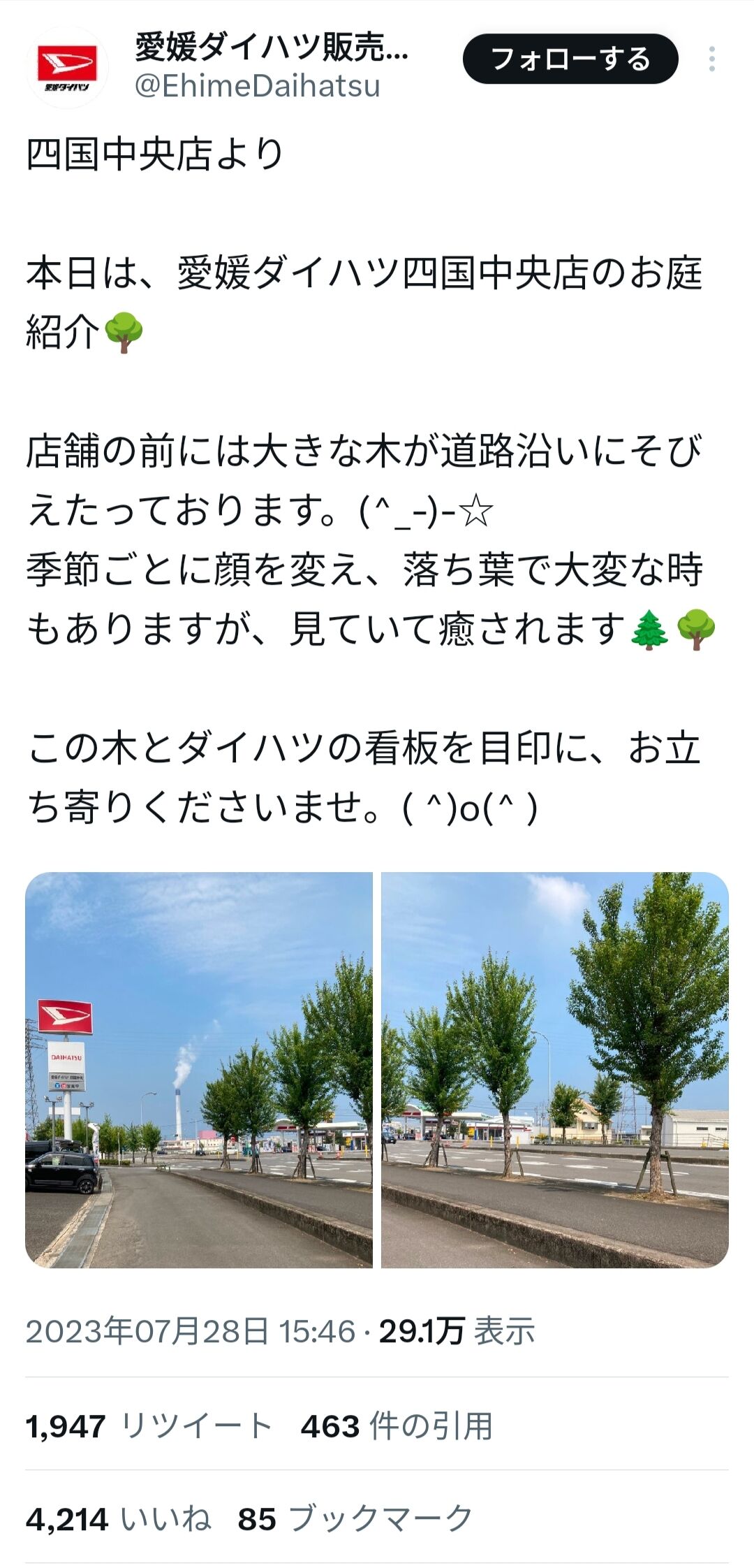 ダイハツさん、なにかを煽る「店の前に生えている木を目印に当店舗へお越しください」
