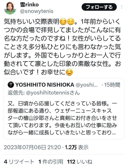 檜山沙耶さん、1年以上前から西岡のテニス観戦していたwwwwww