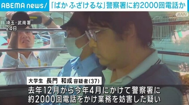 大学生の長門和成容疑者(37)は、埼玉県警・武南警察署に2022年12月から約3カ月の間に、1,996回電話をかけ、業務を妨害した疑いが持たれている。