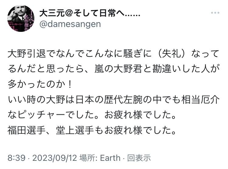 【悲報】中日大野引退報道にジャニオタがざわめく