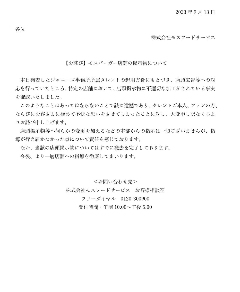 本日発表したジャニーズ事務所所属タレントの起用方針にもとづき、店頭広告等への対応を行っていたところ、特定の店舗において、店頭掲示物に不適切な加工がされている事実を確認いたしました。