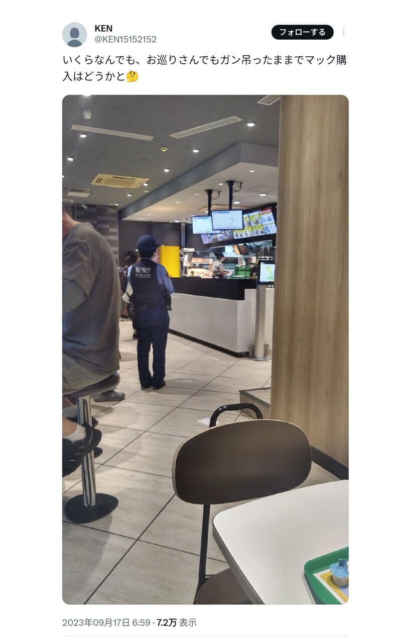 【画像】警察官さん、マクドを買いに来ただけで晒される……
