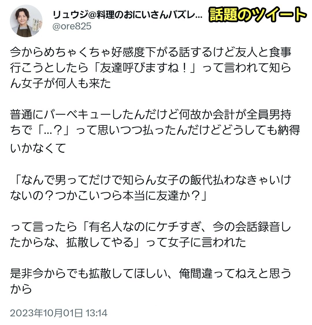 【悲報】料理のお兄さんリュウジ、何故男ってだけで女に奢らないといけないのかと正論をぶつける