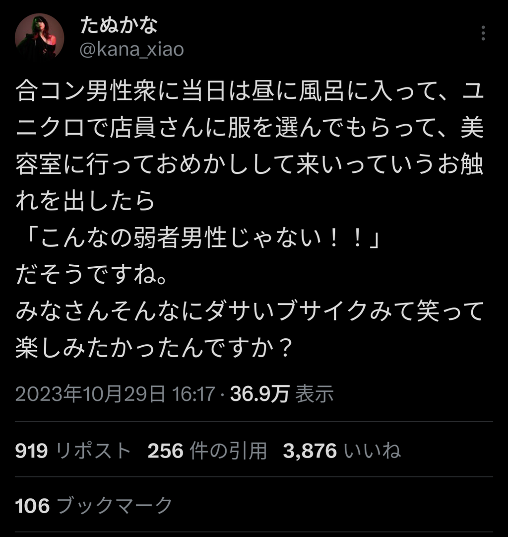 たぬかなさん、弱者男性合コンの参加者を弱者に見えないと言われブチ切れ