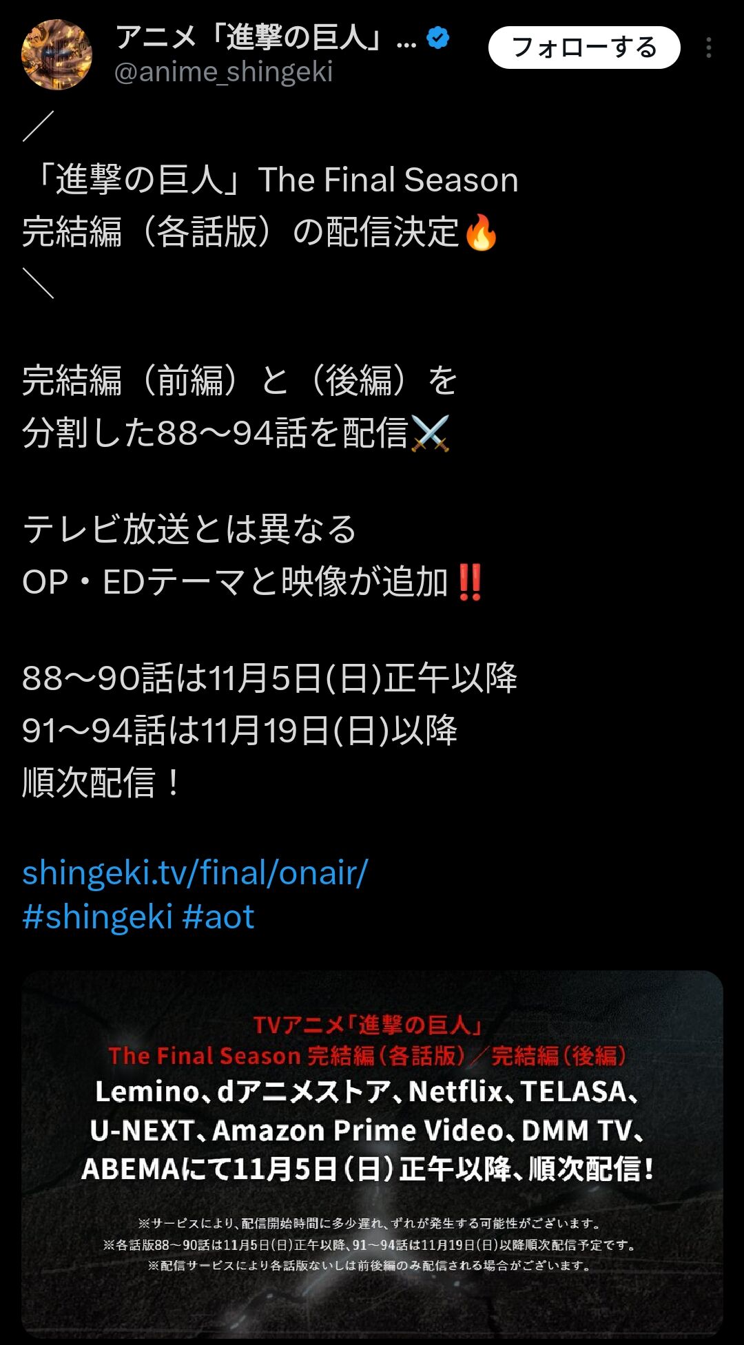 進撃の巨人ファイナルシーズン、前編と後編を30分に区切った各話版があることが判明