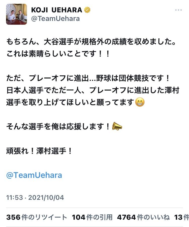 上原浩治さん「野球は団体競技、個人成績の大谷よりPOに進出した澤村を俺は応援する」