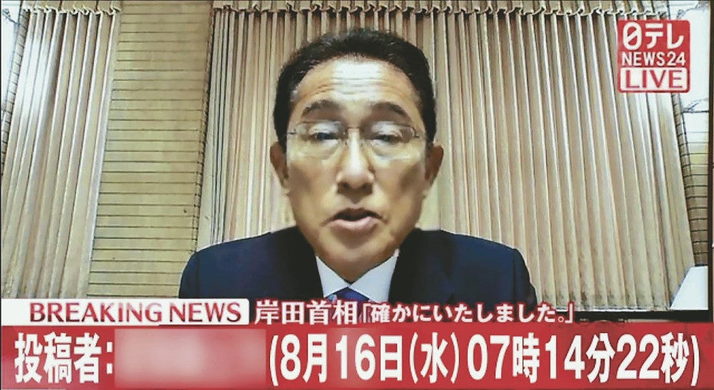 画面の右上には、日本テレビのニュース専門チャンネル「日テレNEWS24」のロゴが入っており、同番組で実際に使用されているものに似せたテロップで、「岸田首相 『確かにいたしました』」などと表示されている。「LIVE」や「BREAKING NEWS」という文字もあり、岸田首相の話が緊急速報として生中継されているかのような印象を与える。