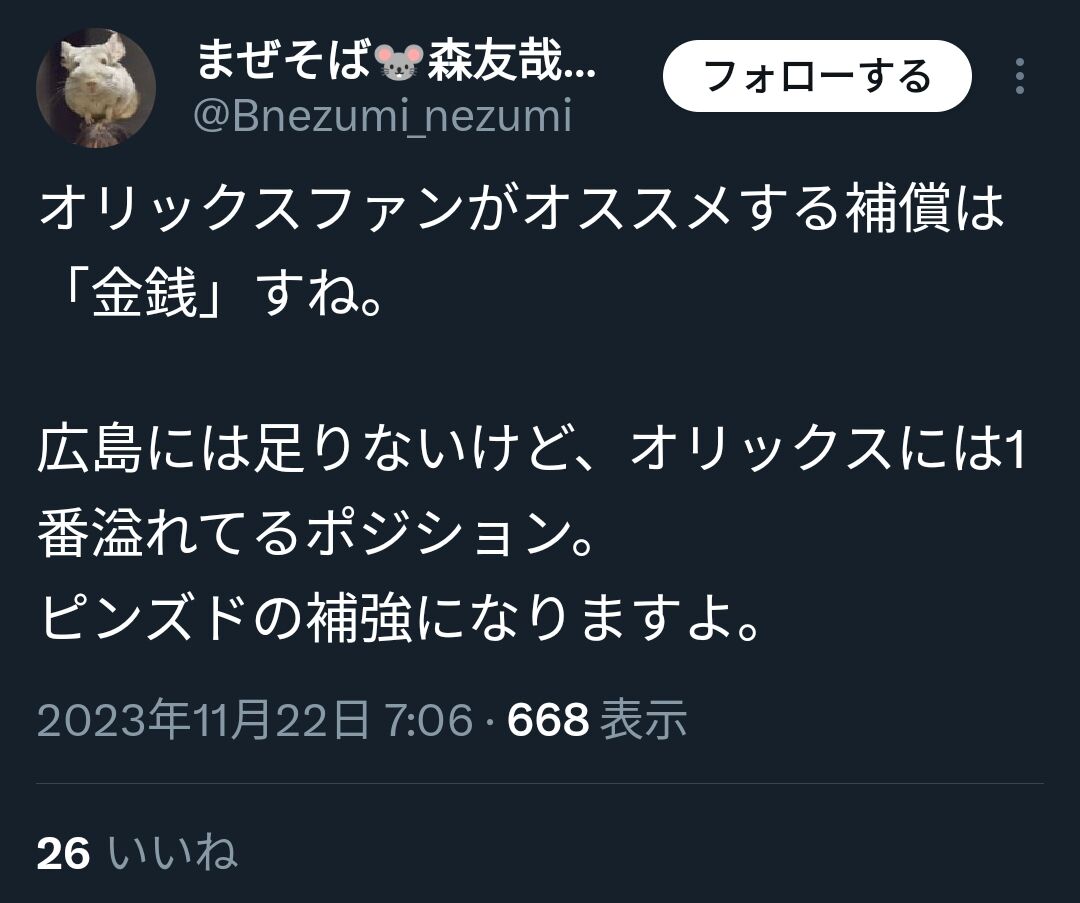 【画像】オリファン「広島は金無いから金銭が1番の補強になりますよ」