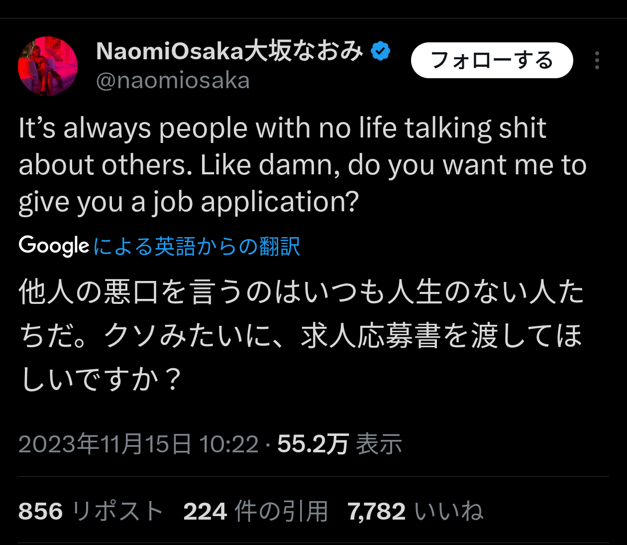 【悲報】大坂なおみさんブチギレ「他人の悪口を言うヤツは人生終わってる」