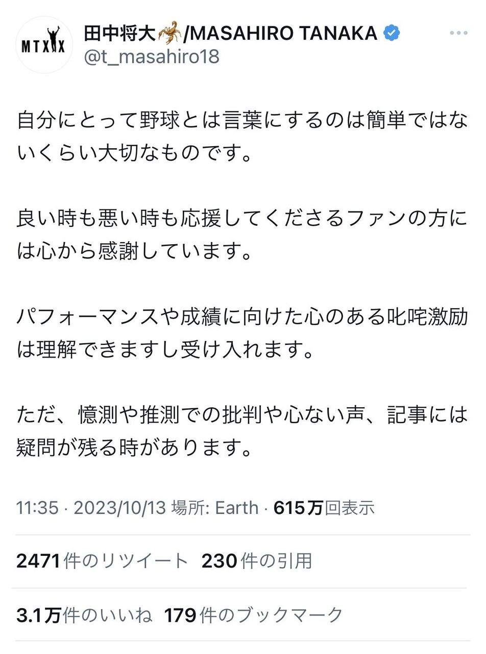 田中将大「自分にとって野球は言葉にできないほど大切。憶測での批判はやめろ」