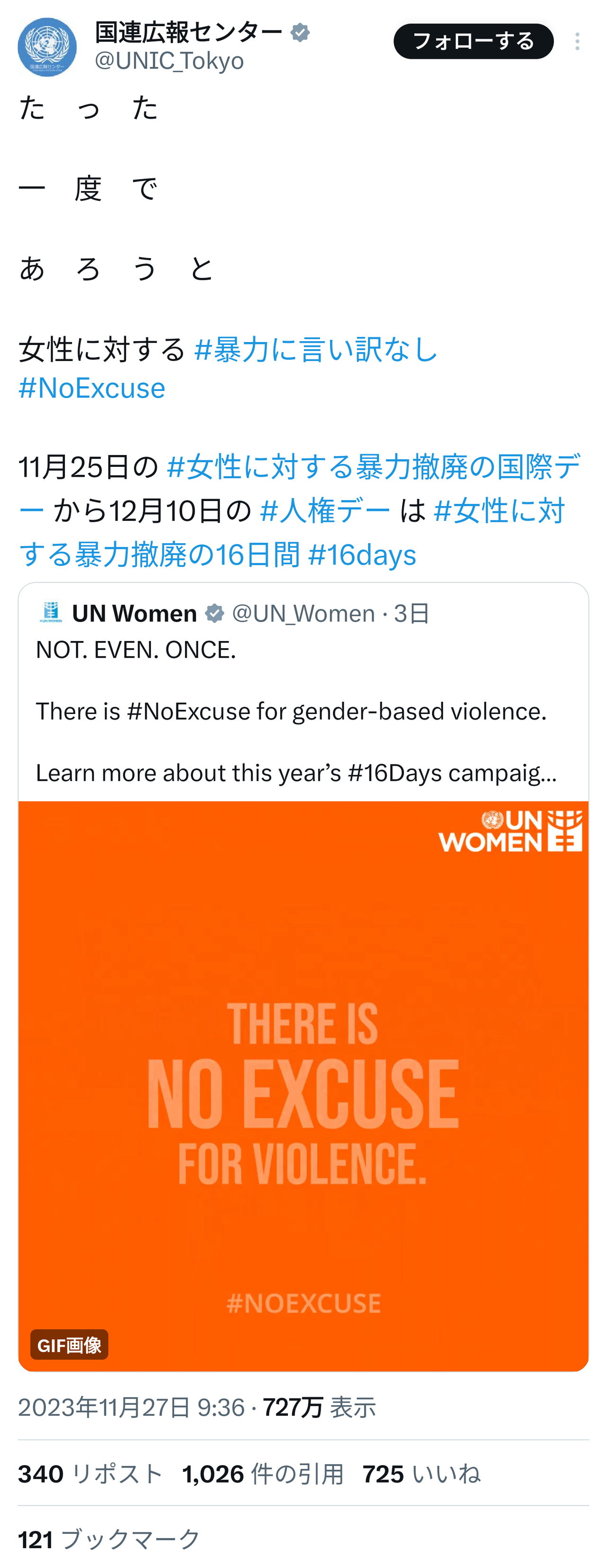 国連広報センター「た っ た 一 度 で あ ろ う と 女性に対する # 暴力に言い訳なし」