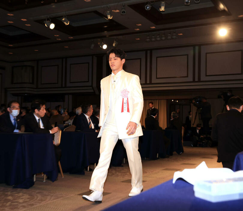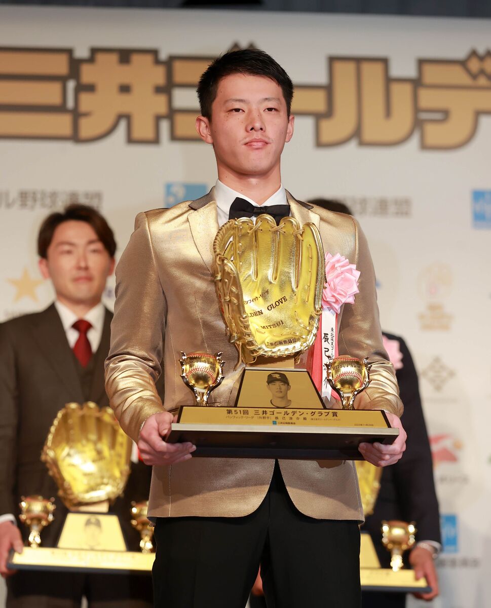 楽天辰己涼介さん、GG賞表彰式にてド派手な上下純白のキラキラスーツで登場し、会場を沸かせる