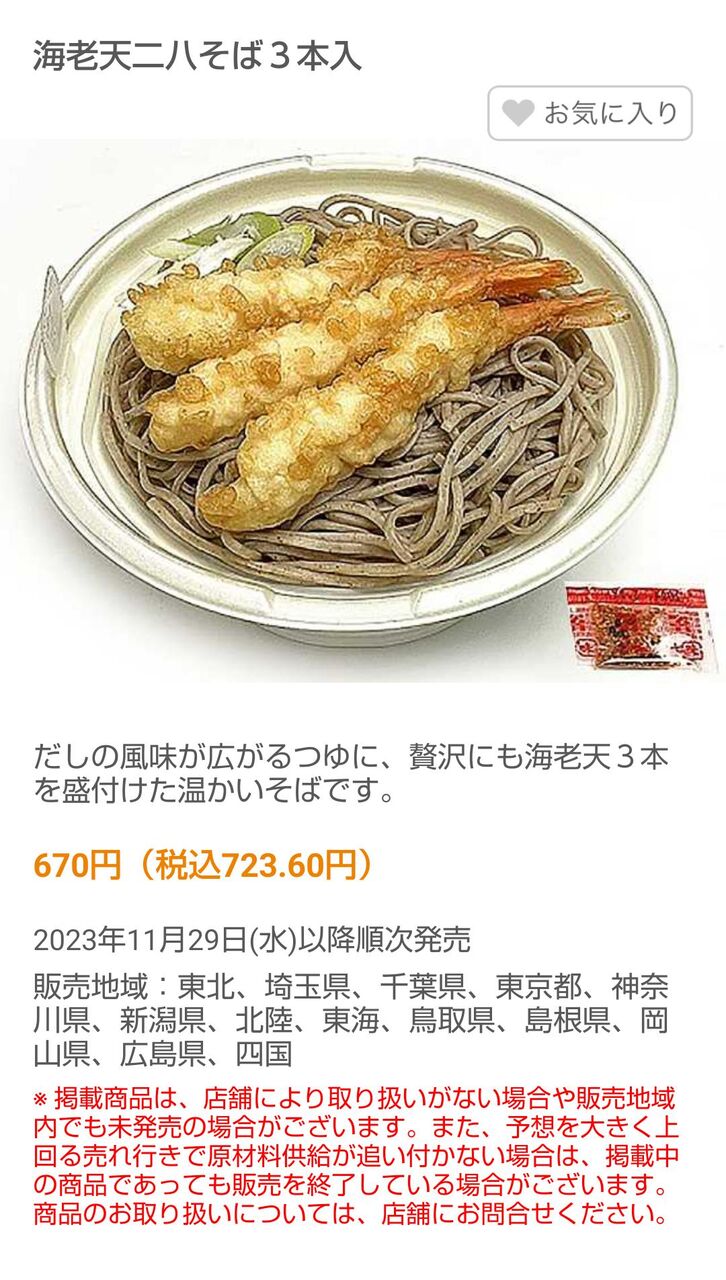 【画像】セブン新作、贅沢にも海老天3本を盛り付けた「海老天二八そば」 670円