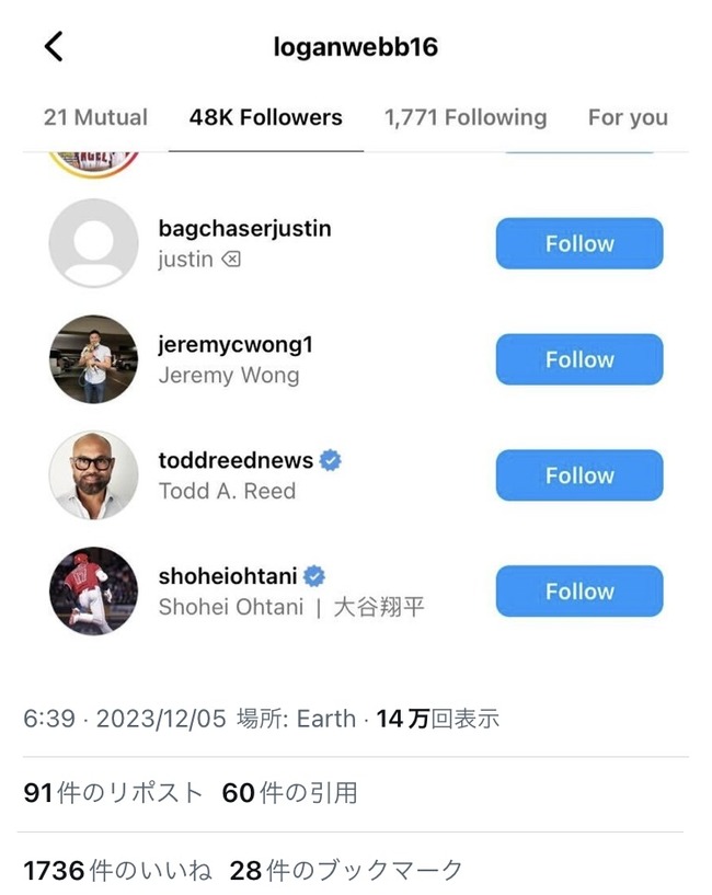 ジャイアンツ選手「大谷からフォロバ来ないギャオオオオン!」 大谷「はぁ……」