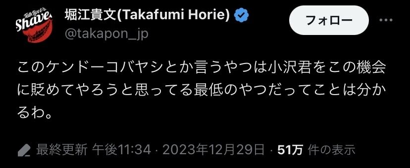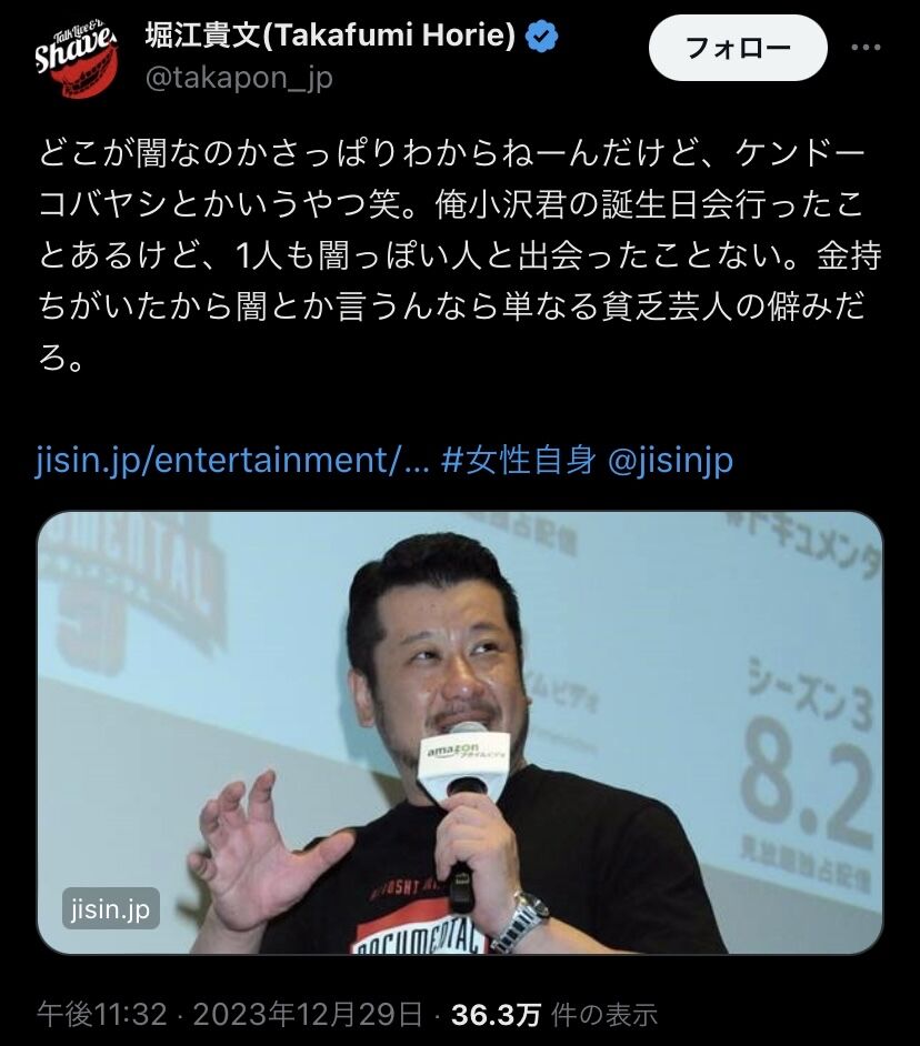 ケンコバ「小沢の誕生日会は芸能界の闇」ホリエモンがブチギレ「俺も行った事あるが闇なんてなかった」