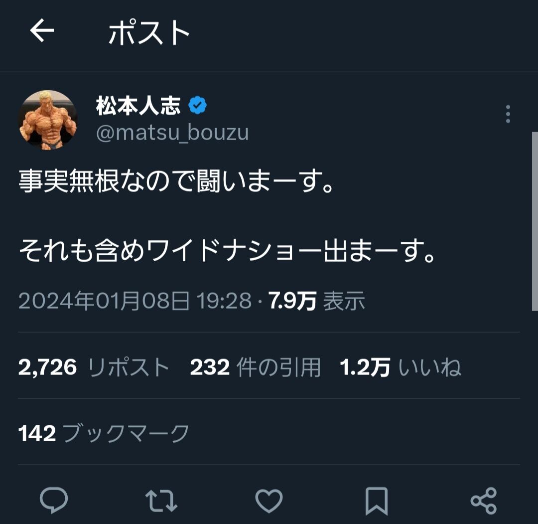 松本人志さん、ツイート「 事実無根なので闘いまーす。」