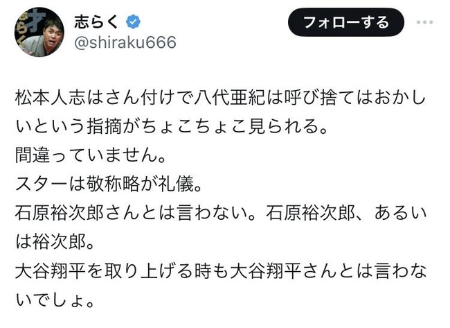 【悲報】志らく「松本人志さんはスターじゃない」
