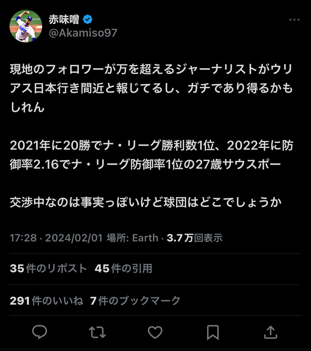 【悲報】中日ファン代表赤味噌さん「ウリアスガチで日本来るかもしれん!!!」
