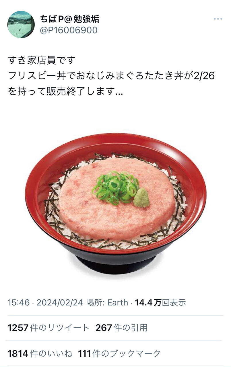 【緊急】すき家のまぐろたたき丼、本日で販売終了へ