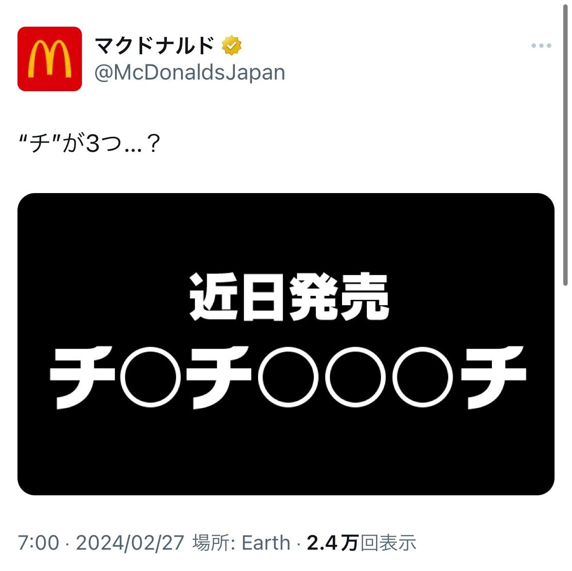 【速報】マクドナルド、「チ〇チ〇〇〇チ」を近日発売します