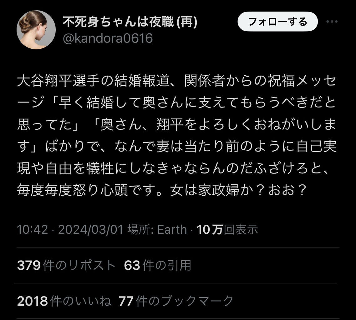 女さん、大谷の結婚にブチギレ「何で妻は当たり前のように自由を犠牲にしなきゃいけないの?おお?」