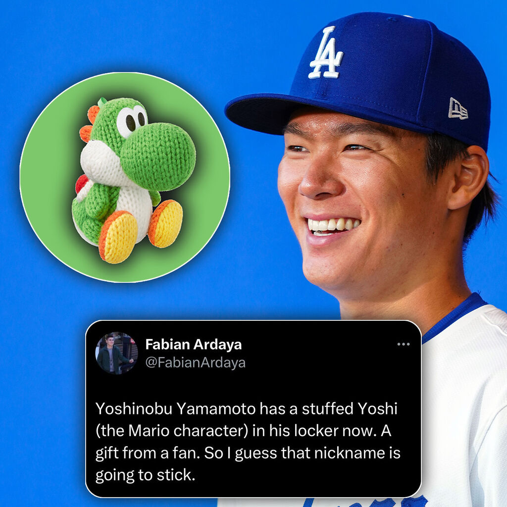 【朗報】MLB公式「ファンが山本由伸にYoshiぬいぐるみをプレゼント!」