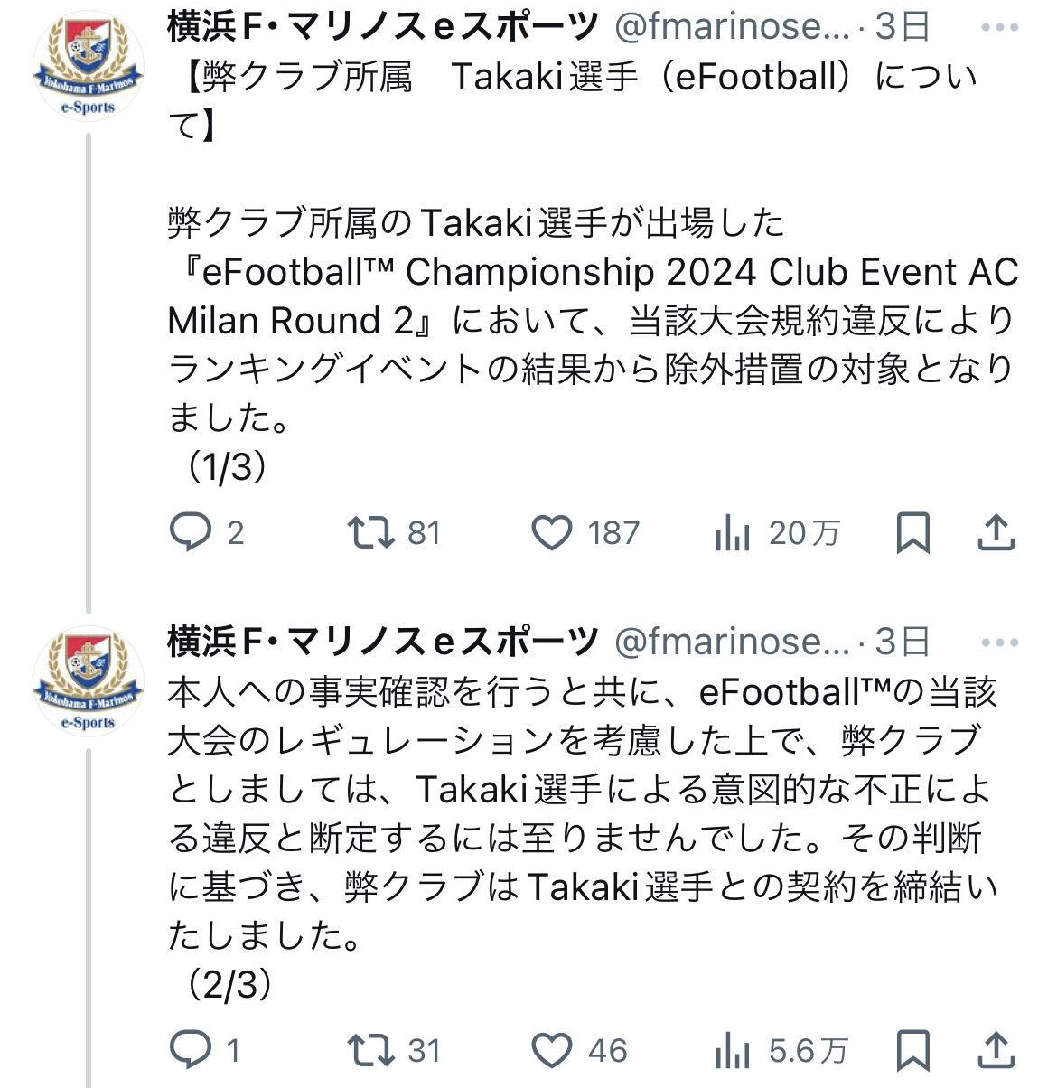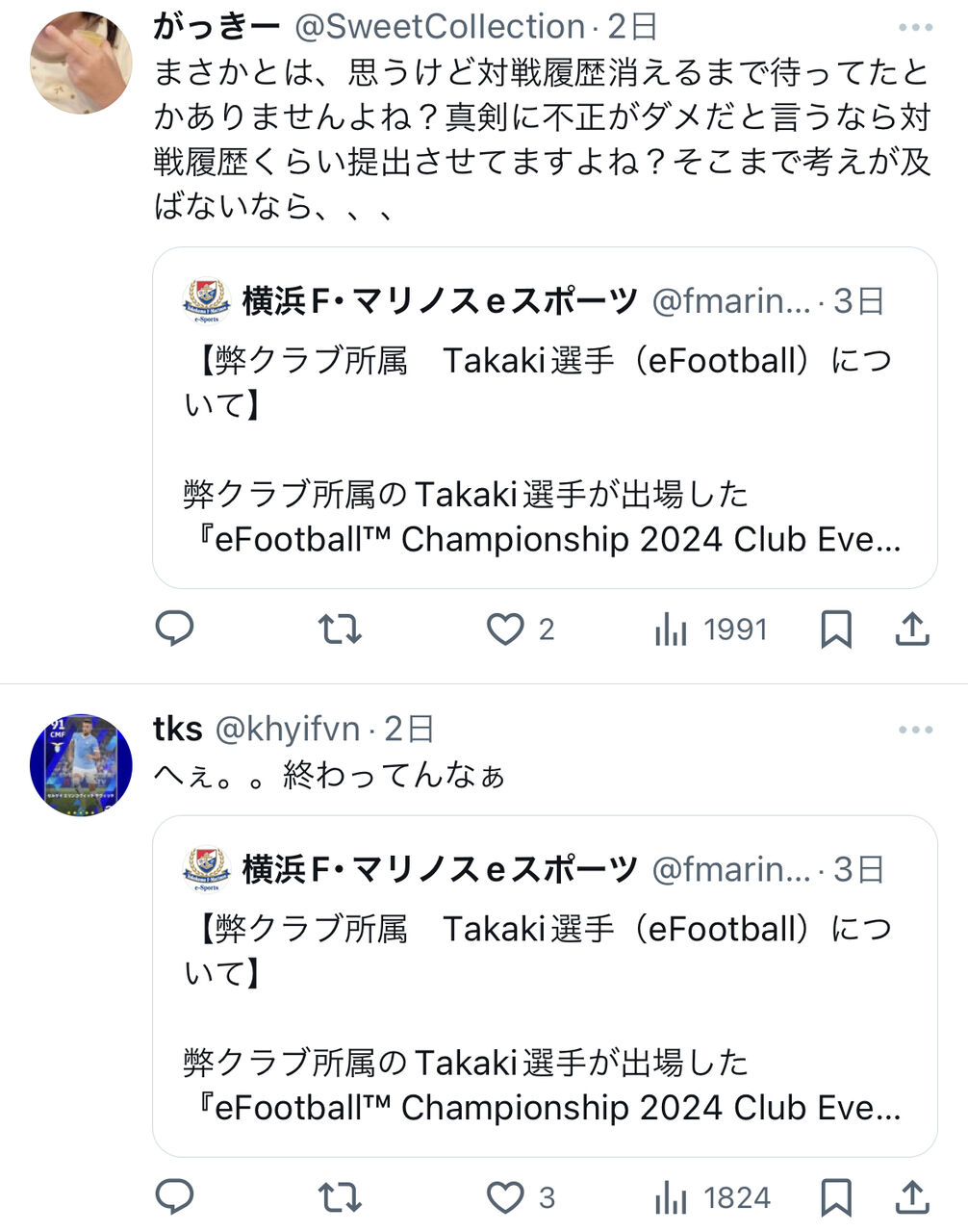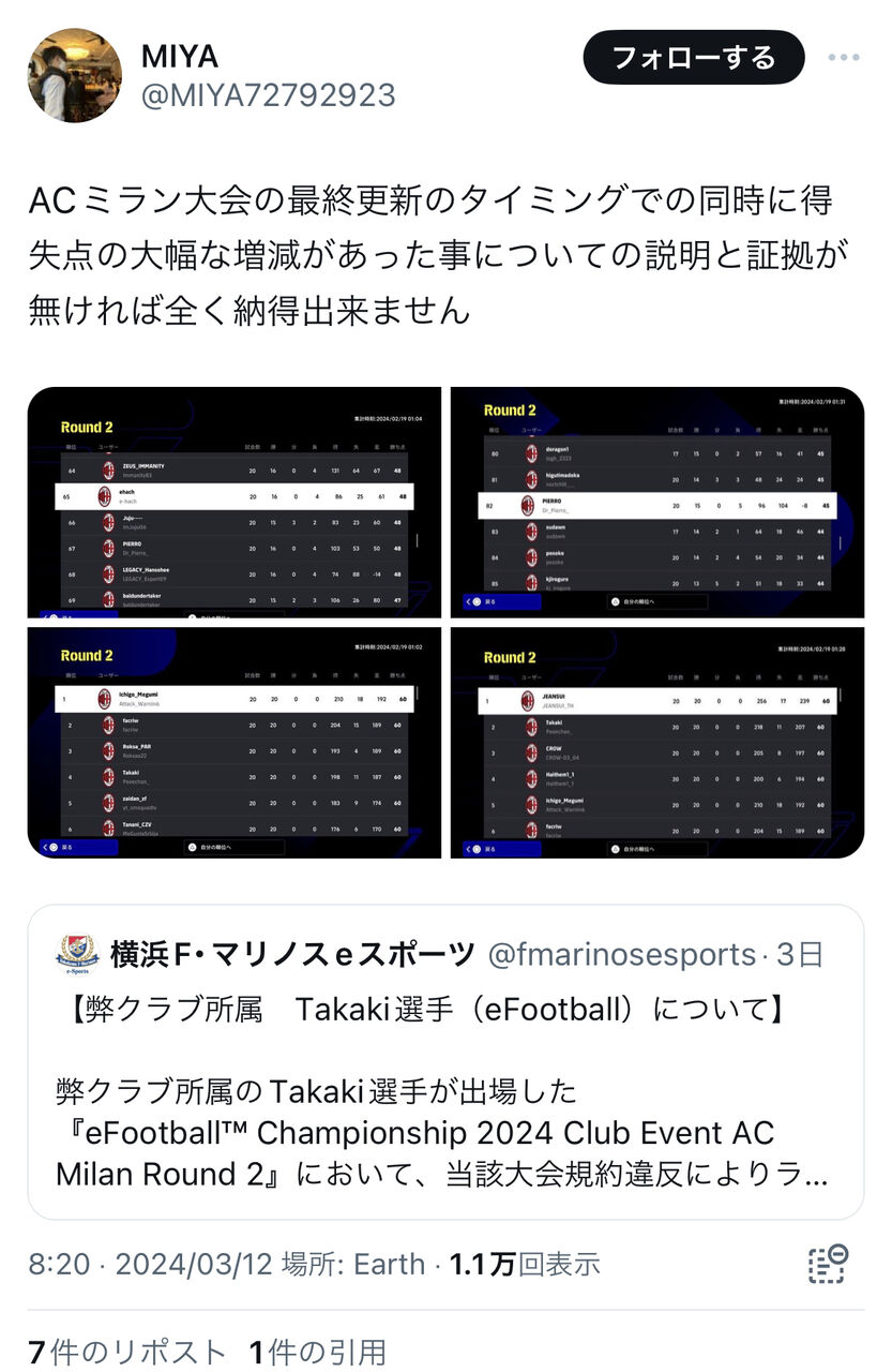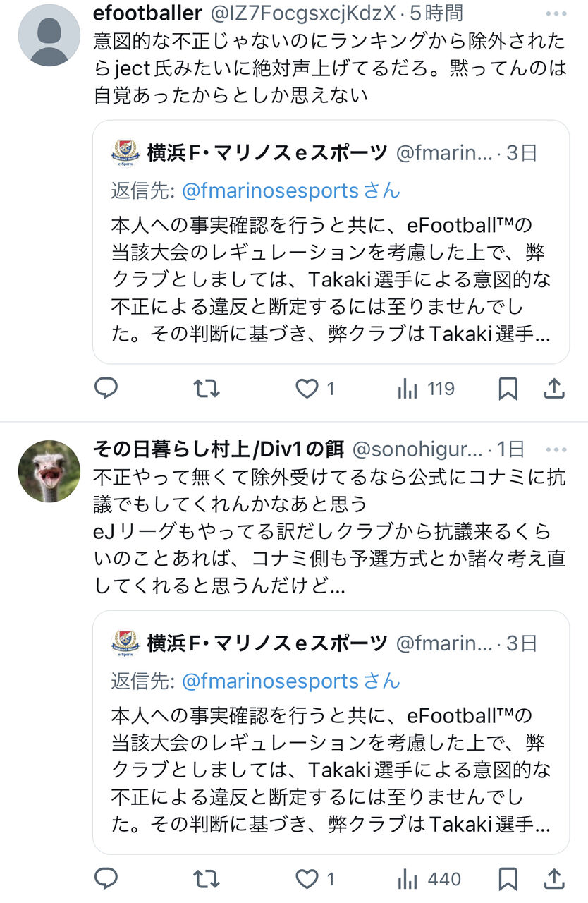 イーフトの公式大会予選でマリノスeスポーツチーム所属の元イーフト世界王者プロゲーマーが大量得点の談合不正試合疑惑が出る