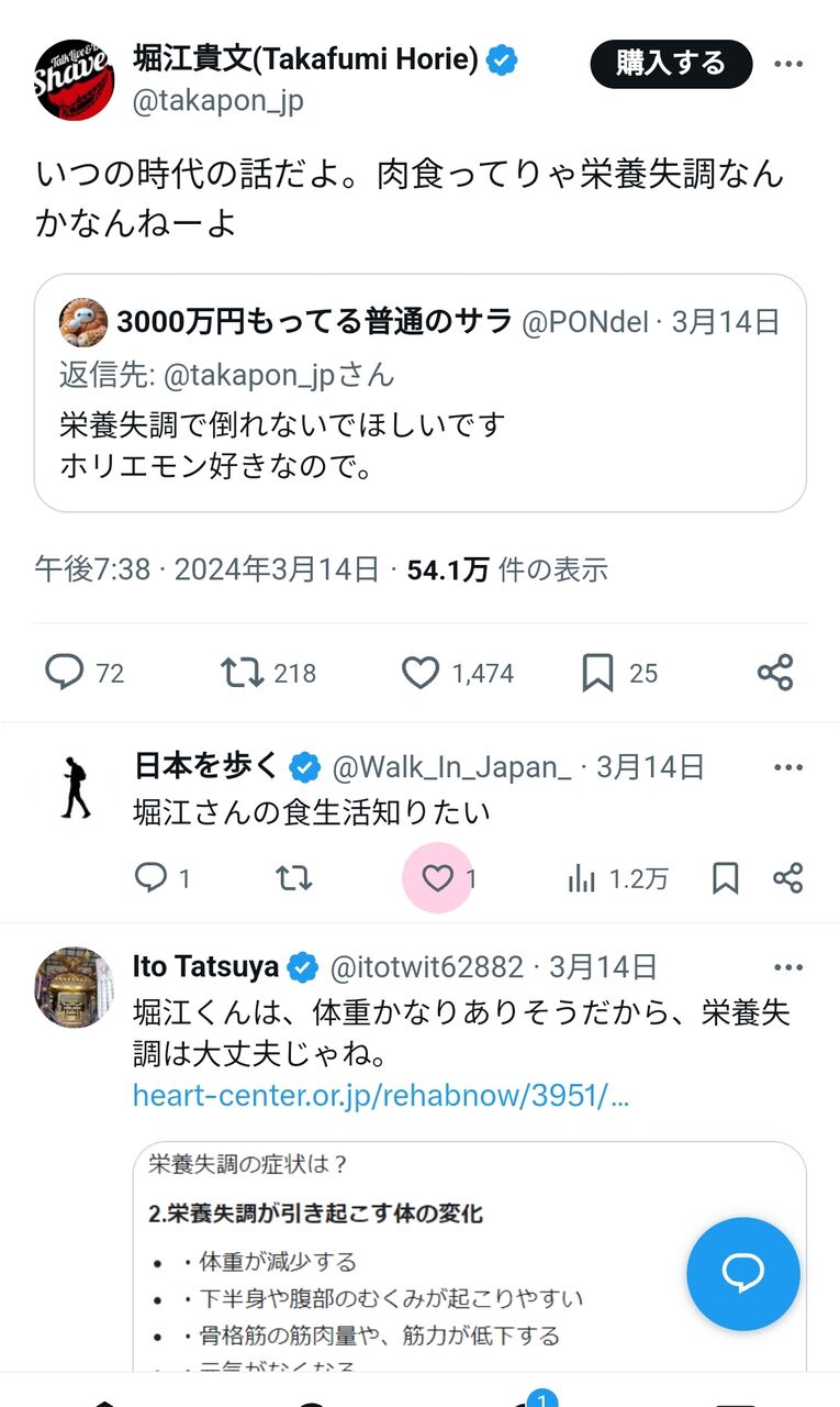 【朗報】堀江貴文さん「肉食ってりゃ栄養失調なんかなんねーよ」