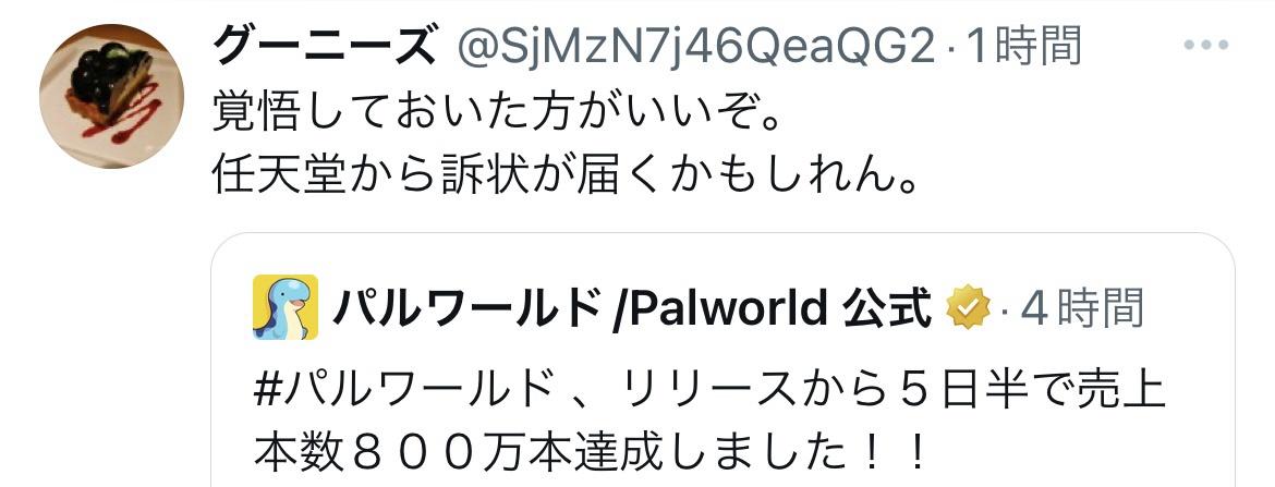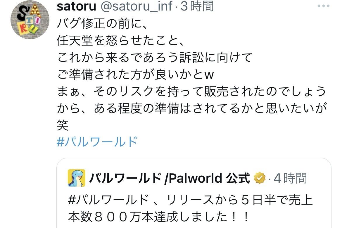 【悲報】🤓「パルワールドさん、任天堂を怒らせたので覚悟した方がいいかと(ニタャァ」